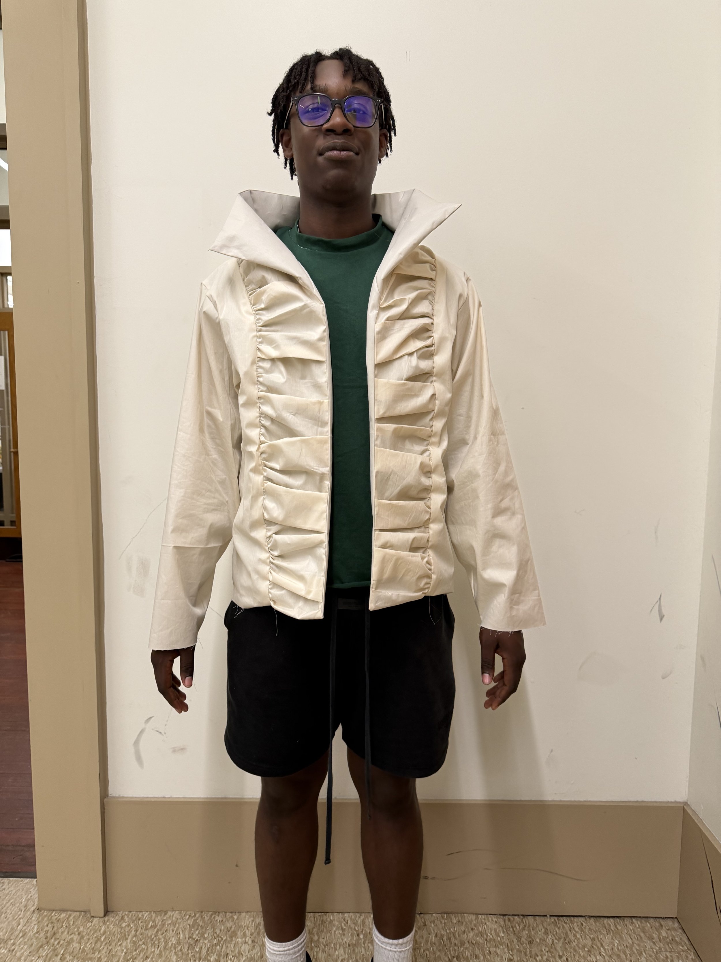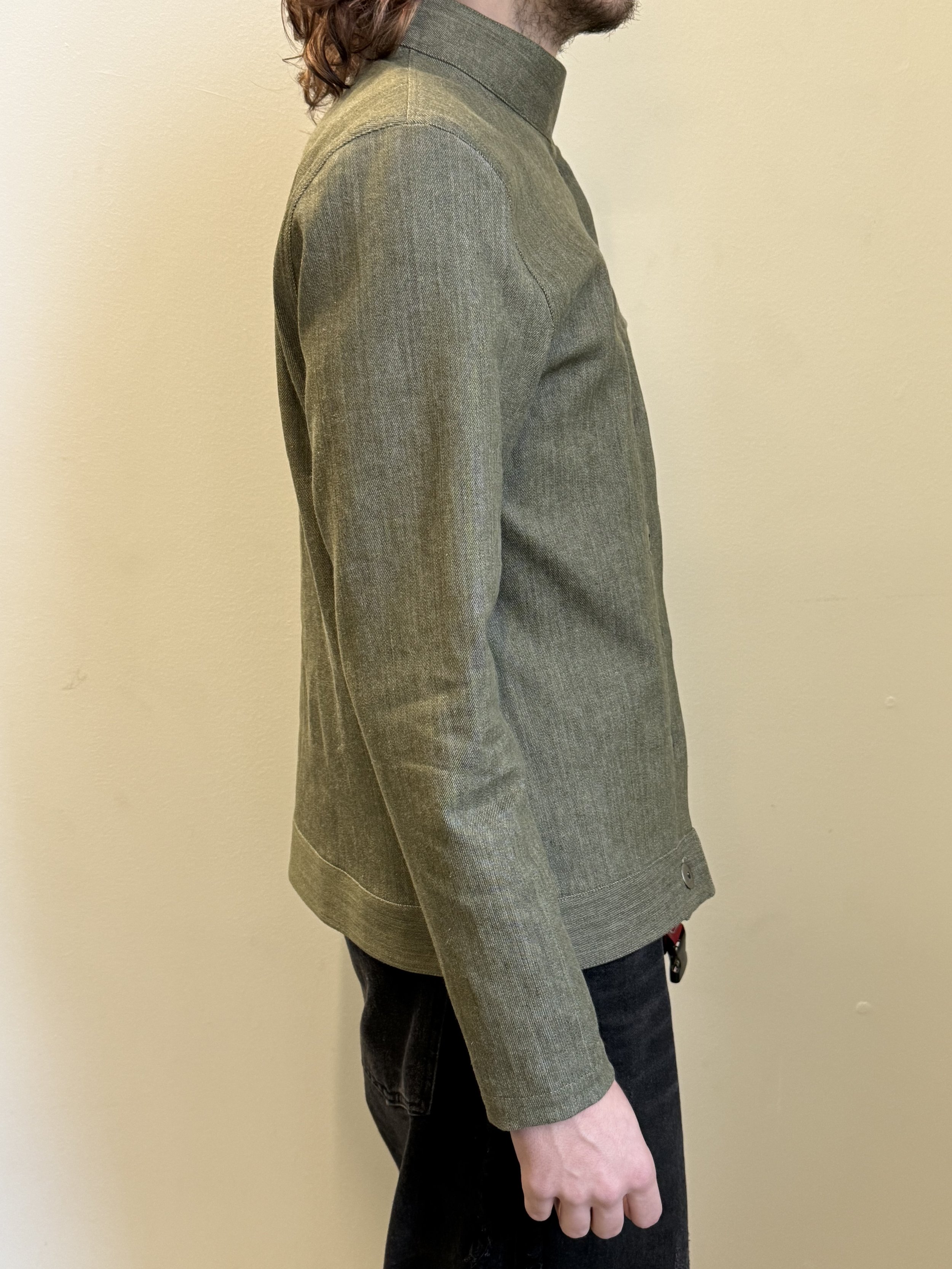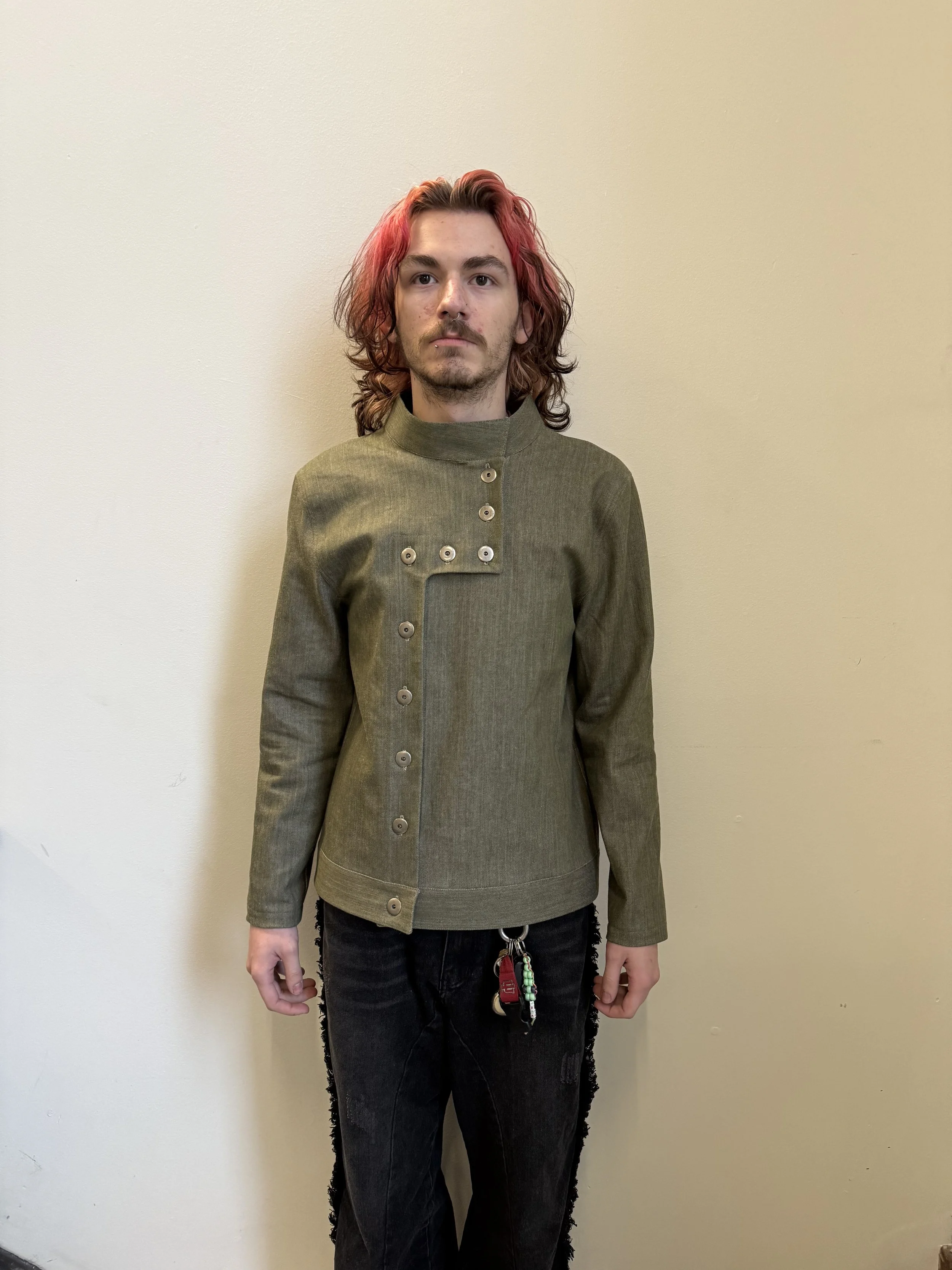 Inspired by the circus stunt ‘Globe of Death’ as well as fencing, I created an asymmetrical lightweight jacket. A green selvedge denim is used for the body to portrary that roughness.