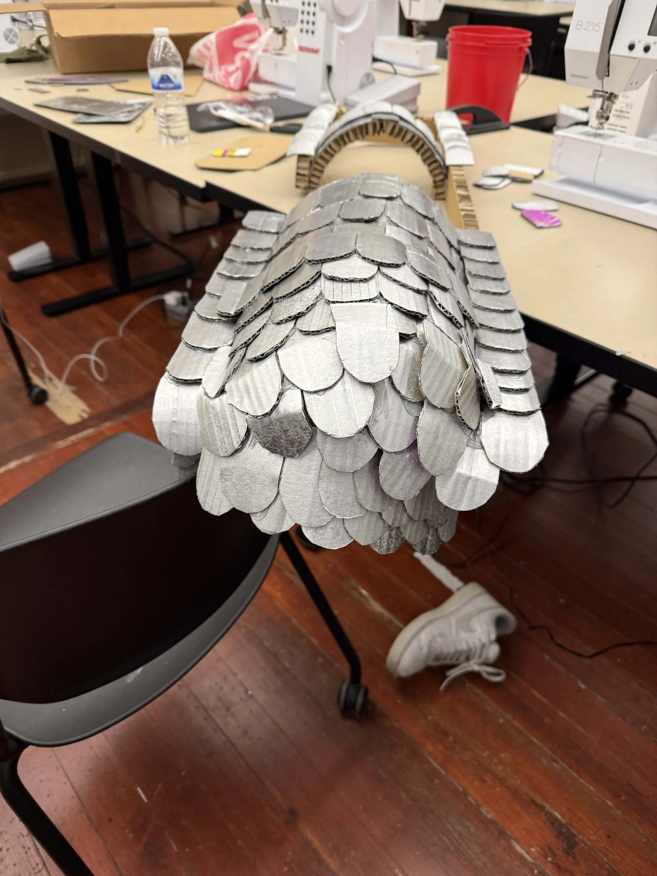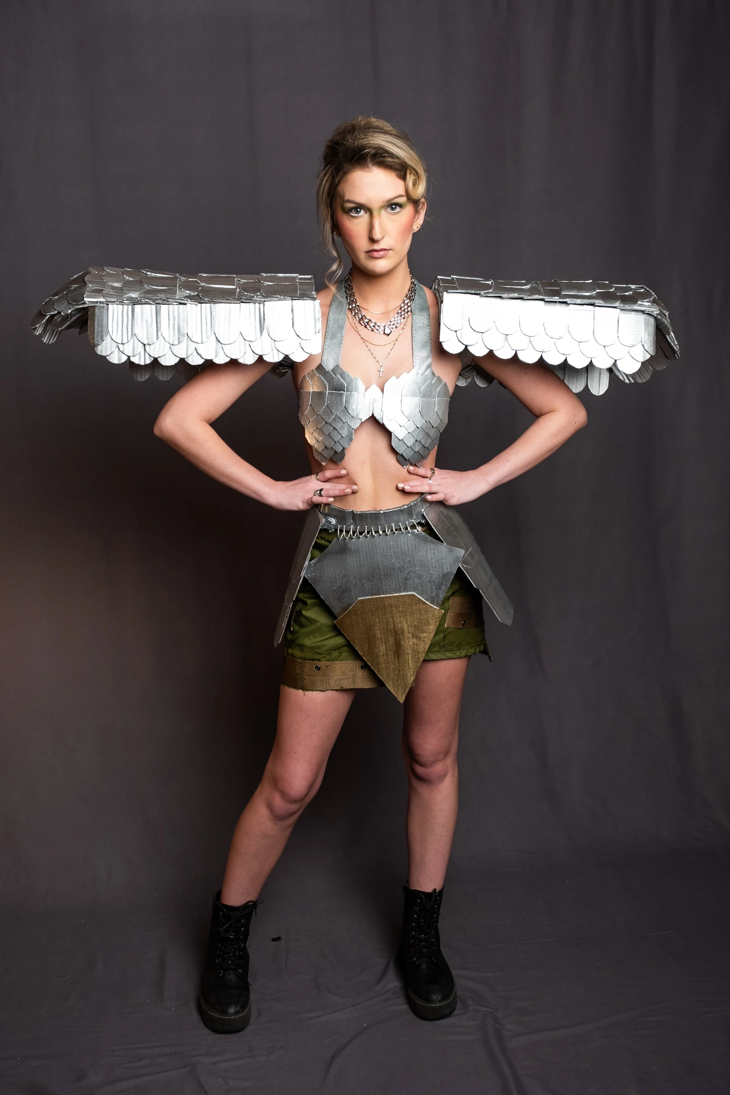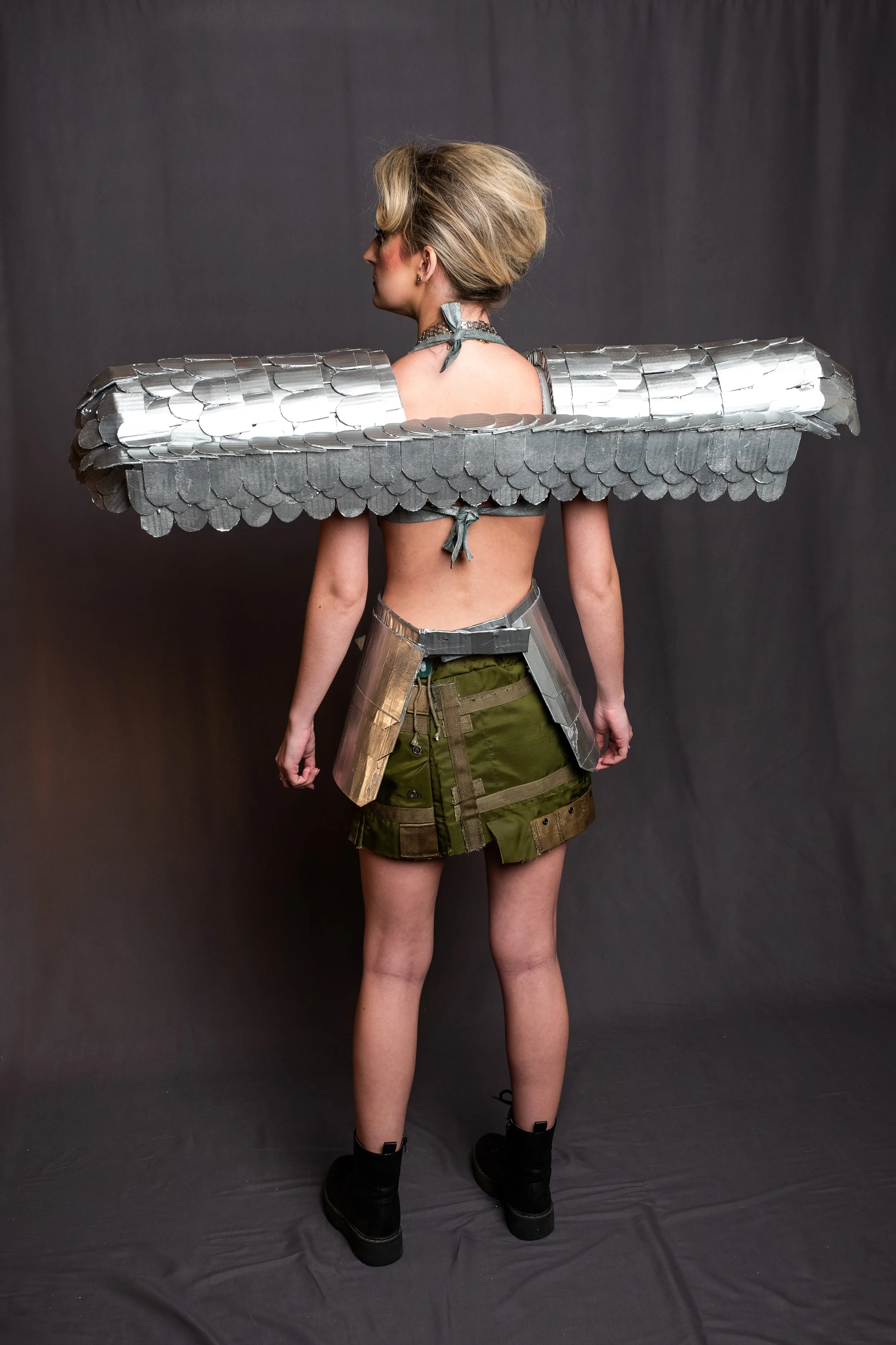 Born from recycled materials, the ensemble Armored Ascension was created with the use of cardboard, hot glue, and a repurposed military backpack.